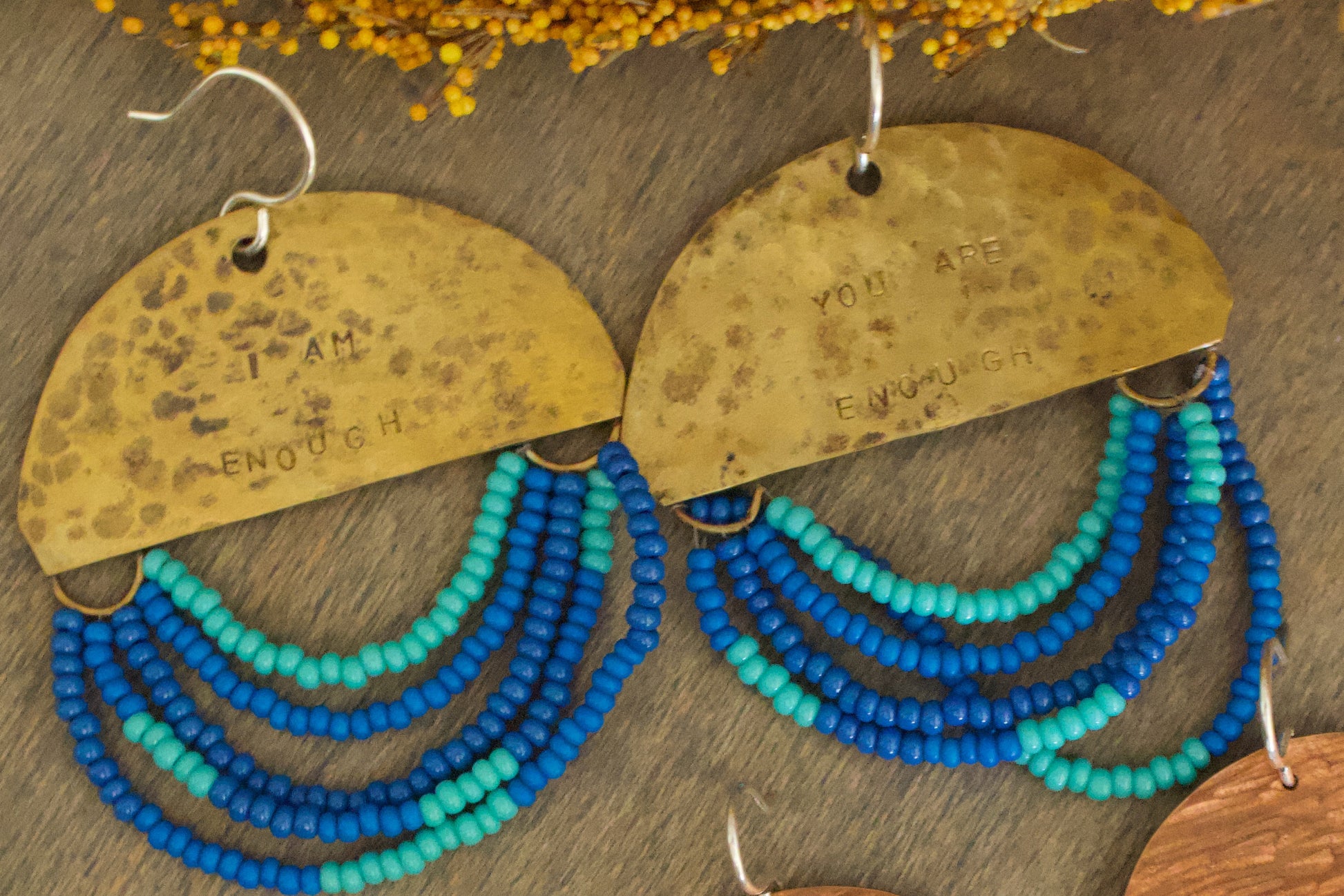 - Earrings: Large brass half-moons, hand-forged from raw sheet metal: sawn, textured, filed, and finished by hand. Stamped with I AM ENOUGH / YOU ARE ENOUGH to honour both declaration and reflection. Each piece features hand-strung seed beads in oceanic hues of blue and turquoise, symbolizing truth and calm. Finished with handmade sterling silver hooks.