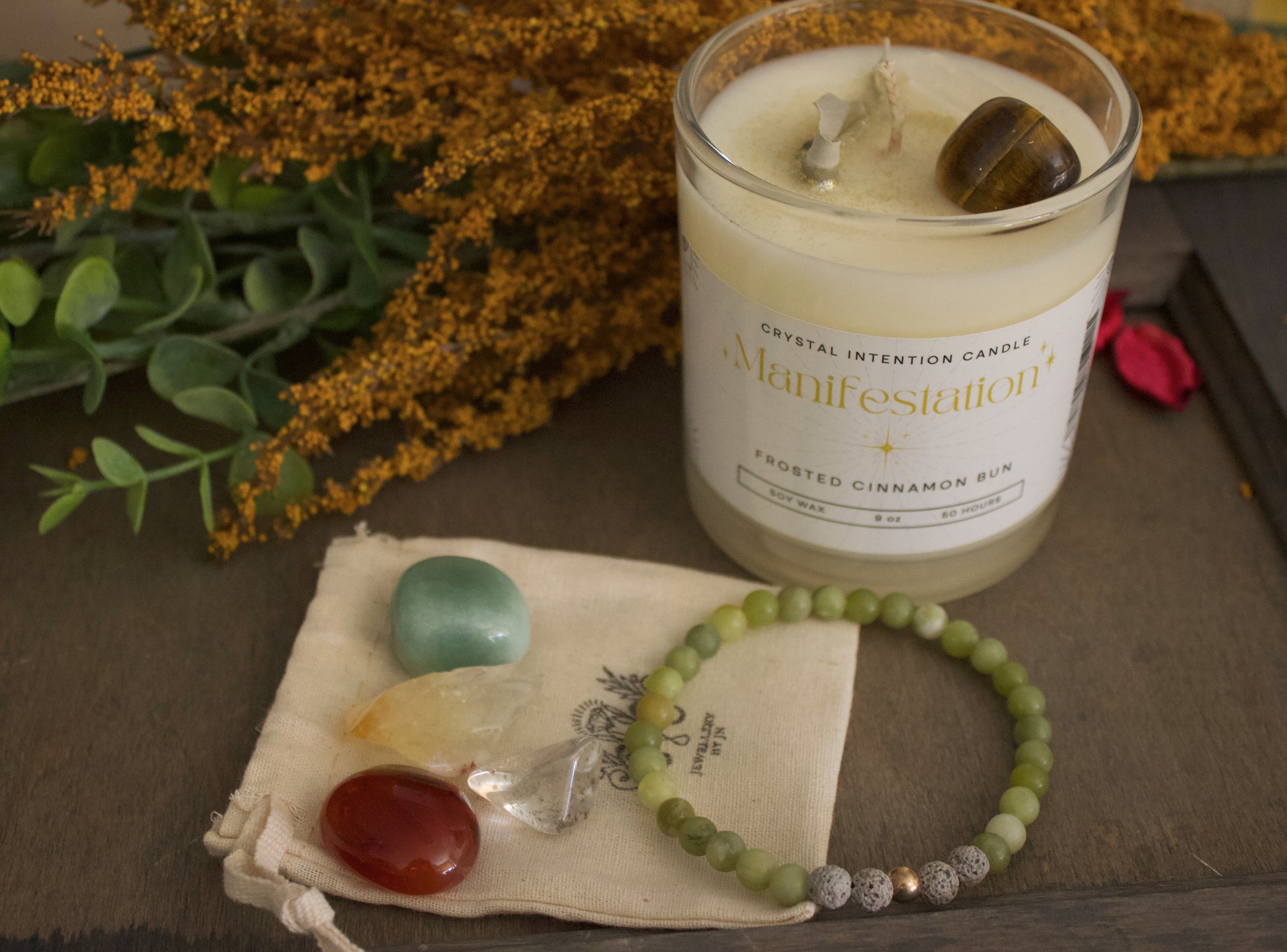 - Candle: Manifestation Intention Candle: Cashmere & Musk scent with Tiger’s Eye, Carnelian, and Clear Quartz crystals. Hand-poured to awaken focus, gratitude, and creative expansion.