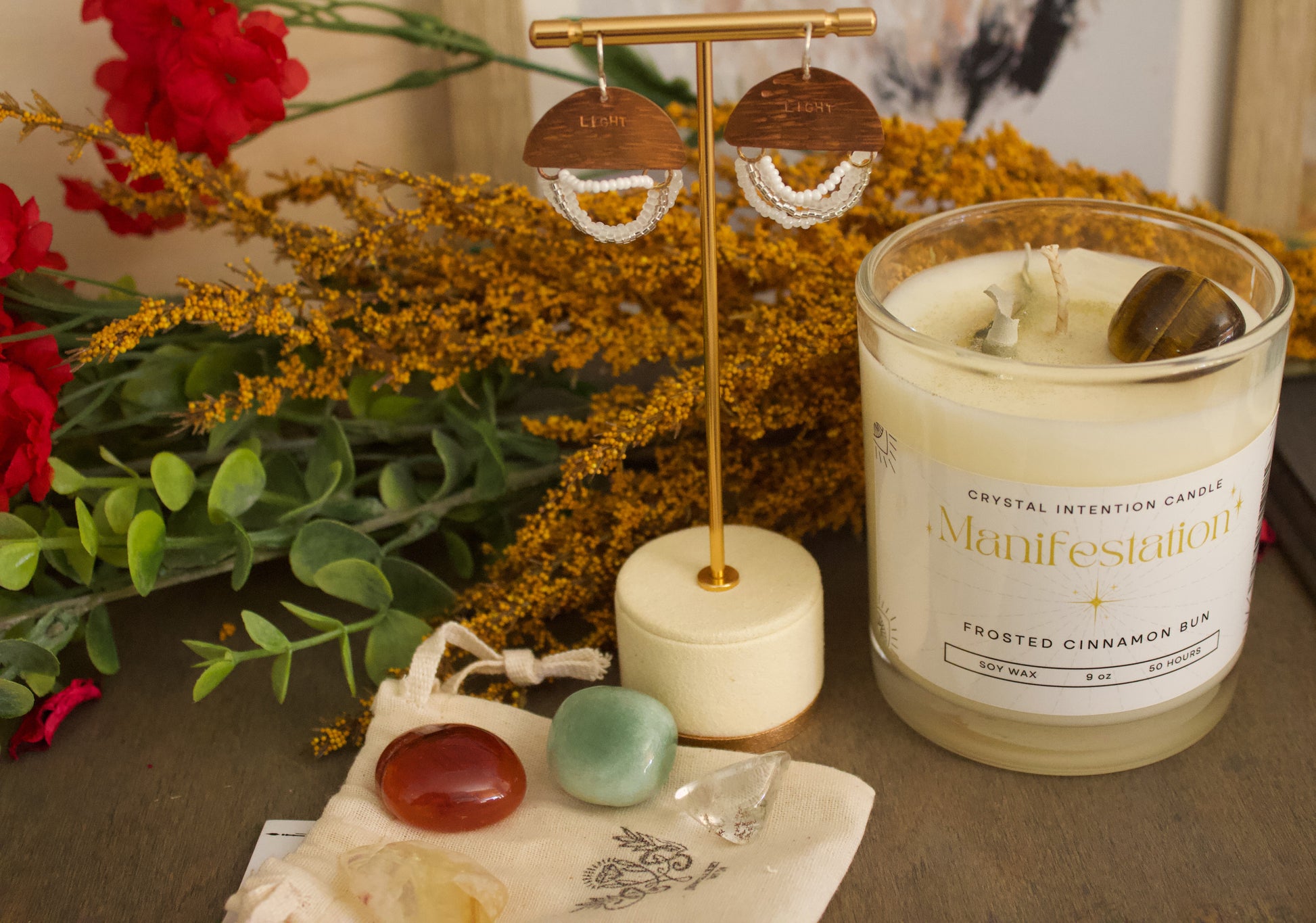 - Candle: New Beginnings Intention Candle: Lemon & Sage scent with dried orange slices, rosemary, citrine, and clear quartz. Fresh, clarifying, and bright- for clearing old energy and welcoming the new.