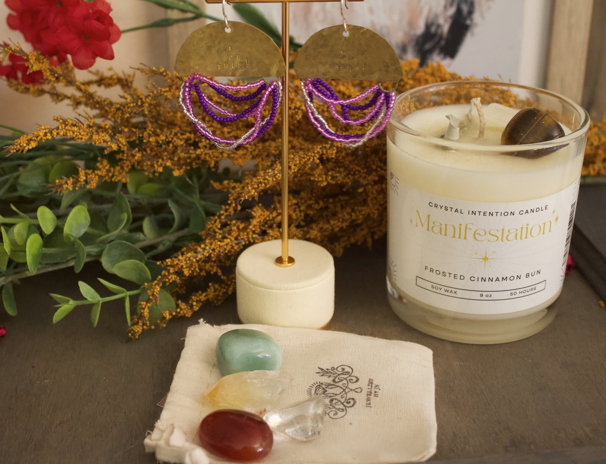 - Candle: Manifestation Intention Candle: Cashmere & Musk scent with Tiger’s Eye, Carnelian, and Clear Quartz crystals. Hand-poured to encourage focus, optimism, and steady energy as you step forward in your purpose.