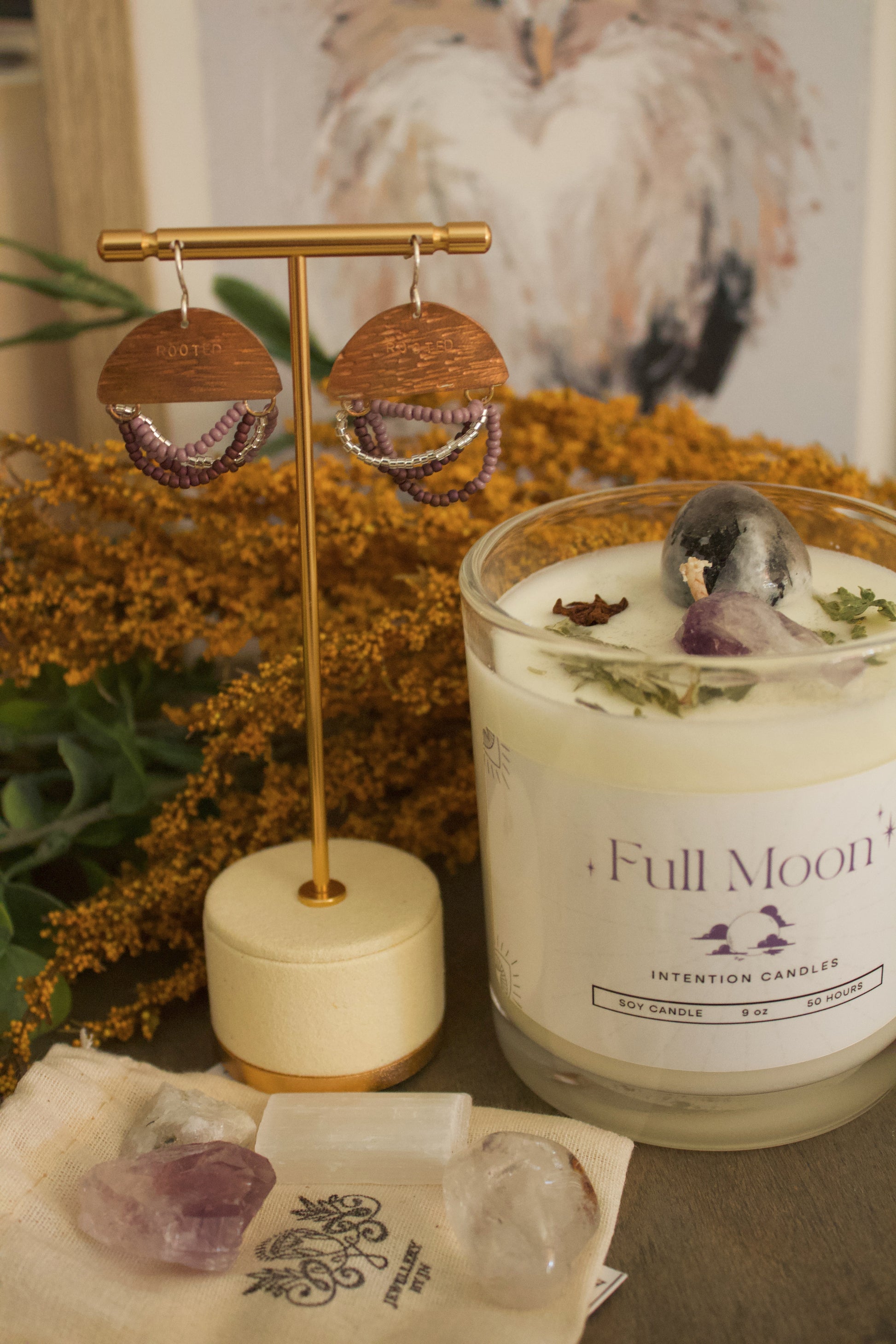 - Candle: Full Moon Intention Candle : Apple & Spice scent with cedar leaf, star anise, mugwort, black salt, moonstone, amethyst, and silver glitter. Hand-poured for reflection and renewal.